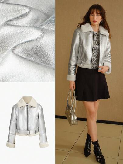 MOTF STUDIO SHEEPSKIN & FUR HYBRID BUCKLE BELTED JACKET - Silver - View 1