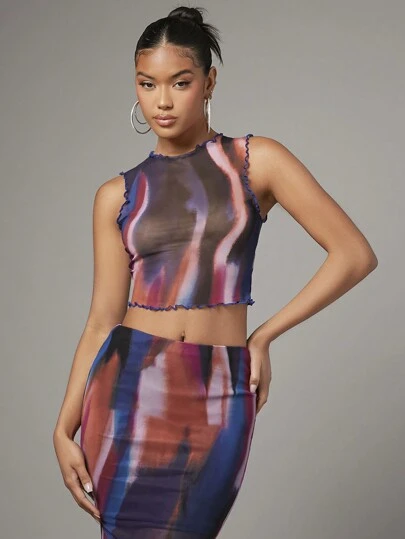 SHEIN BAE Tie Dye Lettuce Trim Crop Tank Top - Purple - View 1