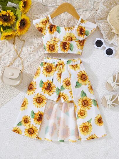 SHEIN Baby Girl Sunflower Print Cold Shoulder Ruffle Trim Top & Shorts - White - View 1