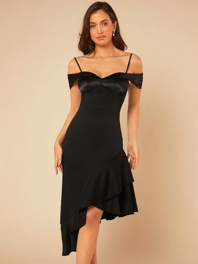 SHEIN Belle Cold Shoulder Ruffle Hem Dress - Black - View 1
