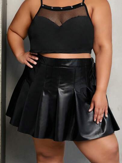 SHEIN CURVE+ Plus PU Leather Pleated Skirt - Black - View 1
