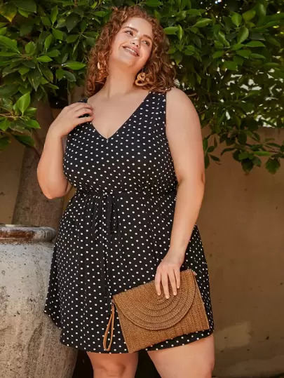 SHEIN CURVE+ Plus Polka Dot Belted Dress - Black - View 1