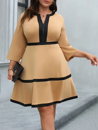 SHEIN CURVE+ Plus Size Color Block Roll Edge Zipper Dress - Khaki - View 1