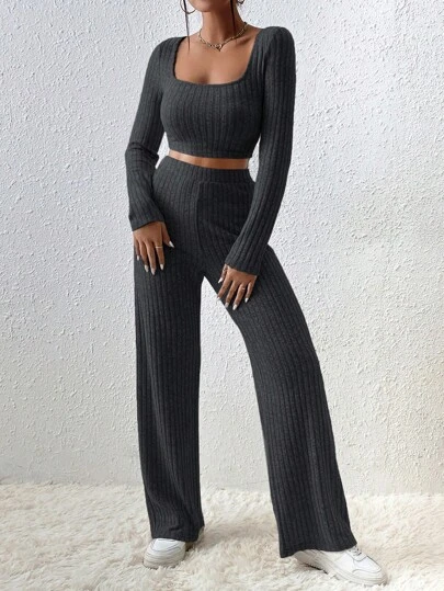 EURMUSE Cotton 2pcs/Set Ribbed Short Sleeve T-Shirt & Long Pants Outfits - Dark Grey - View 1