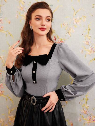 Vintamour Vintage Elegant New Year Women Sweater, Knit Textured Color-Block Square Collar Bow Pearl Button Decor Long Sleeve Top - Grey - View 1