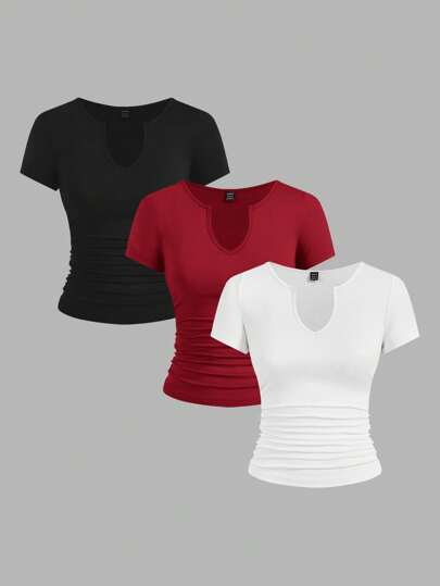 SHEIN EZwear 3pcs/Set Summer Casual Solid Color Notched Neck Ruched T-Shirts - Burgundy - View 1