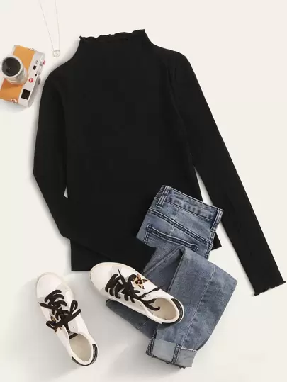 SHEIN EZwear Ribbed Mock Neck Lettuce-Edge Top - Black - View 1