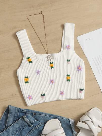 SHEIN Unity Floral Pattern Ribbed Knit Top - Apricot - View 1