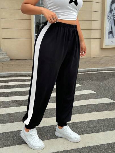 SHEIN EZwear Plus Contrast Side Seam Joggers - Black - View 1