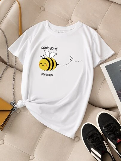 INAWLY Slogan & Bee Print Tee Don't Worry  Bee Happy - White - View 1