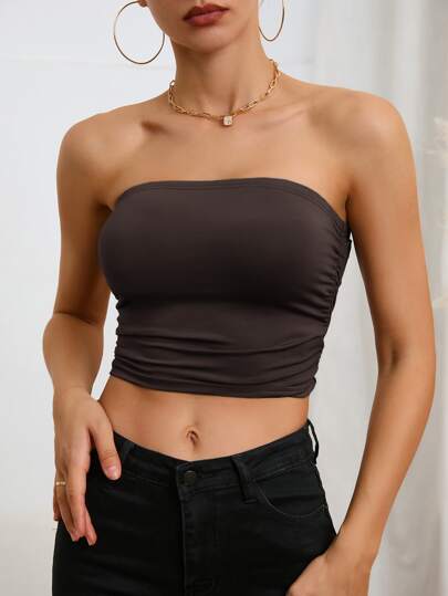 SHEIN Essnce Ruched Side Crop Tube Top - Coffee Brown - View 1