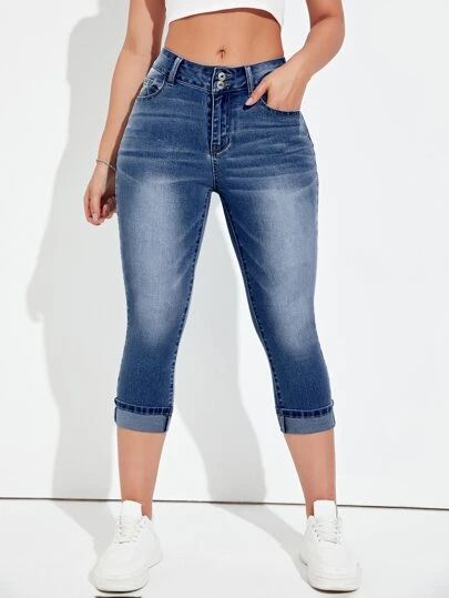 SHEIN Essnce Slant Pocket Skinny Capri Jeans - Dark Wash - View 1
