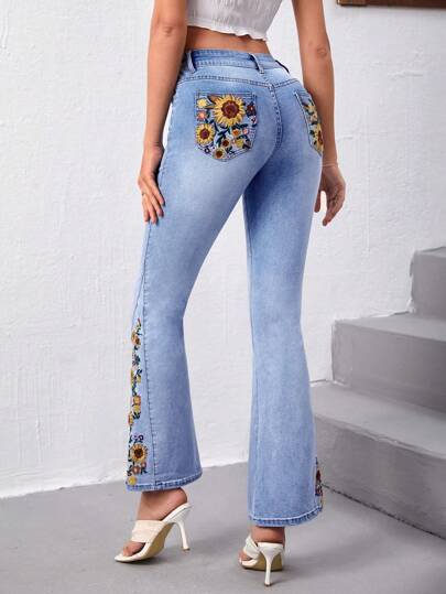SHEIN Essnce Sunflower Embroidery Flare Leg Jeans - Light Wash - View 1