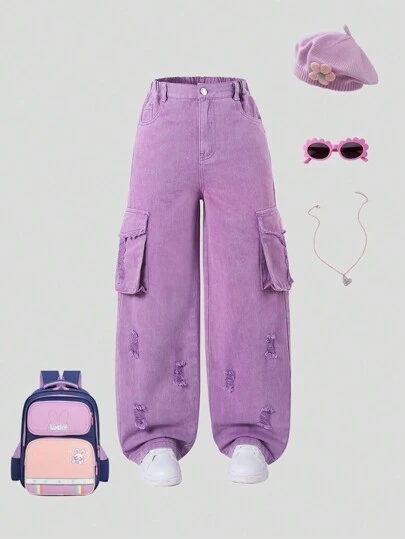 SHEIN Explorewe Tween Girls Elastic Waist Street Punk Ripped Distressed Loose Comfy Multi-Pocket Purple Denim Cargo Pants - Purple - View 1