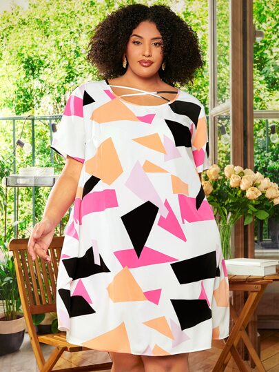 SHEIN CURVE+ Plus Geo Print Tunic Dress - Multicolor - View 1