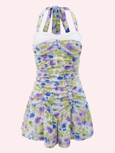 Floral Print Ruched Bust Ruffle Hem Halter Skort Romper - Multicolor - View 1
