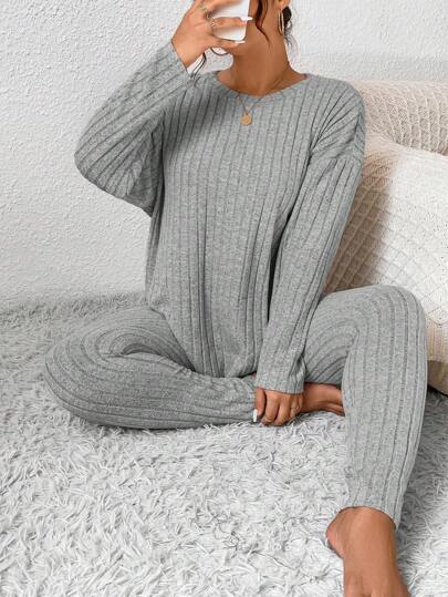 SHEIN Frenchy Ladies Fall Outfits Back To School Workout Set Simple Minimalist Tight Texture Leggings And Long Sleeve Top Set Women Plus Two Pieces Set - Grey - View 1