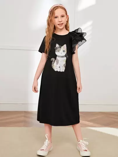 SHEIN Tween Girl Cartoon Graphic Contrast Mesh Ruffle Trim Dress - Black - View 1
