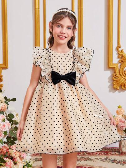SHEIN Girls Polka Dot Print Ruffle Trim Bow Front Mesh Overlay Dress - Multicolor - View 1