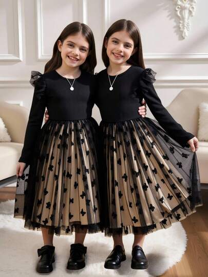 SHEIN Girls' Elegant Ladylike Vacation Cap Sleeve Mesh Ribbed Floral Mesh Dress - Black - View 1