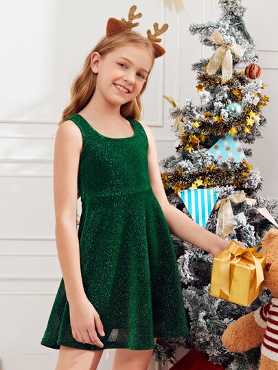SHEIN Girls Glitter A-line Dress - Dark Green - View 1