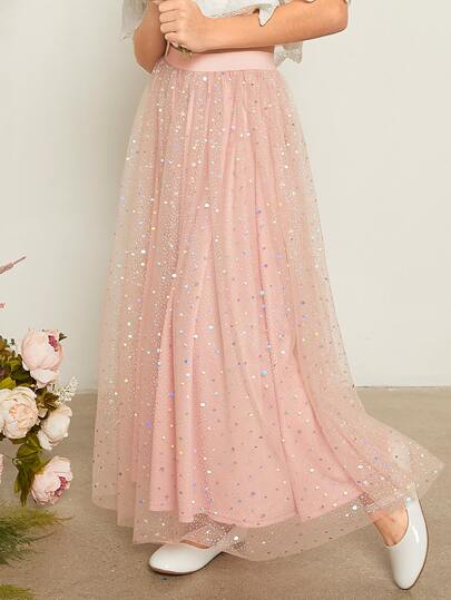 SHEIN Girls Sequins Detail Mesh Overlay Skirt - Baby Pink - View 1