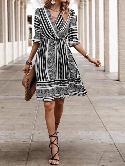 SHEIN Holidaya Allover Print Surplice Neck Ruffle Hem Dress - Black and White - View 1