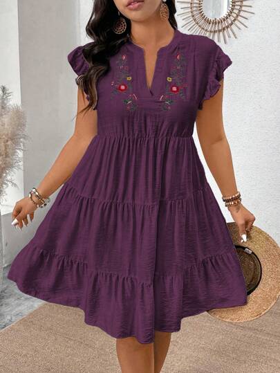SHEIN Clasi V-Neck Embroidered Floral Ruffled A-Line Plus Size Dress - Purple - View 1
