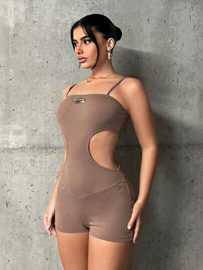 SHEIN ICON Letter Patched Cut Out Waist Cami Unitard Romper - Mocha Brown - View 1