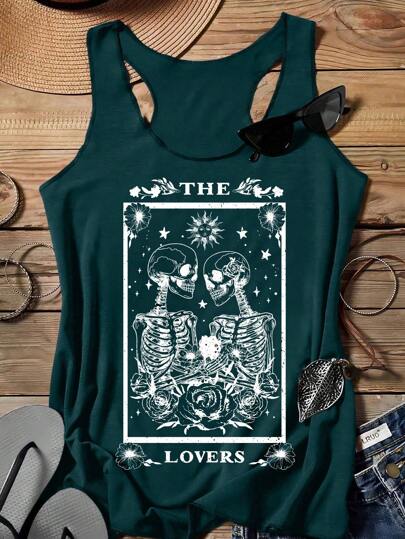 SHEIN LUNE Casual Skull, Floral, Star & Sun Pattern Women Tank Top, Suitable For Summer - Dark Green - View 1