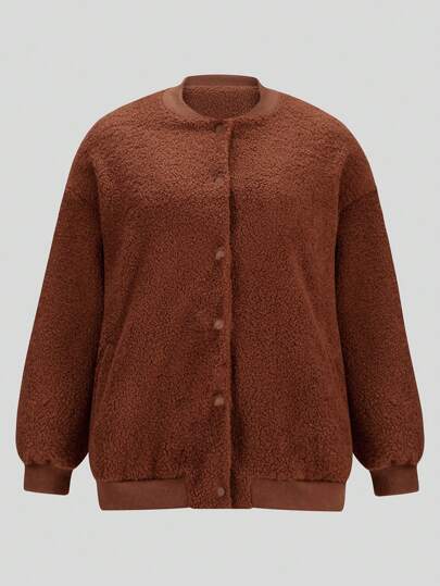 SHEIN LUNE Plus Drop Shoulder Teddy Bomber Jacket Fall Cloth For Women - Coffee Brown - View 1