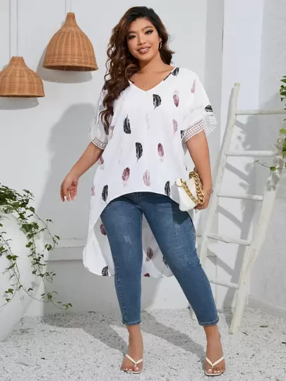 SHEIN LUNE Plus Feather Print Contrast Lace High Low Hem Blouse - White - View 1