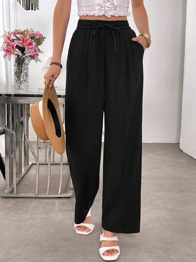 SHEIN LUNE Women Solid Color Ruched Waist Loose Fit Wide Leg Pants - Black - View 1