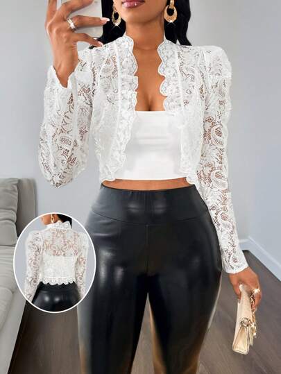 SHEIN Lady Women's White Lace Elegant Ruffled Leg Of Mutton Sleeve Design Jacket - White - View 1