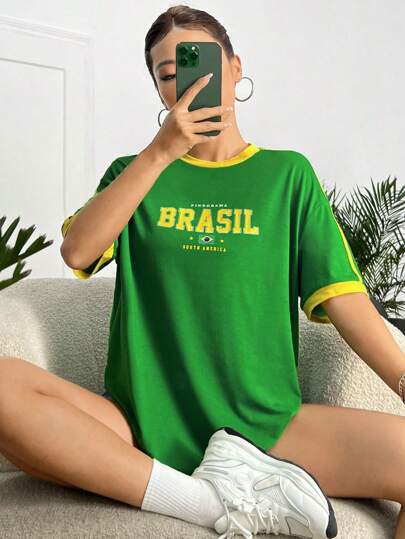 SHEIN EZwear Letter Graphic Drop Shoulder Ringer Tee - Green - View 1