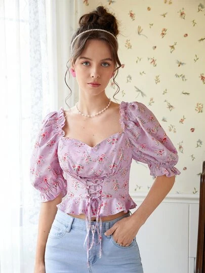 SHEIN MOD Ditsy Floral Print Lace Up Front Ruffle Hem Blouse - Lilac Purple - View 1