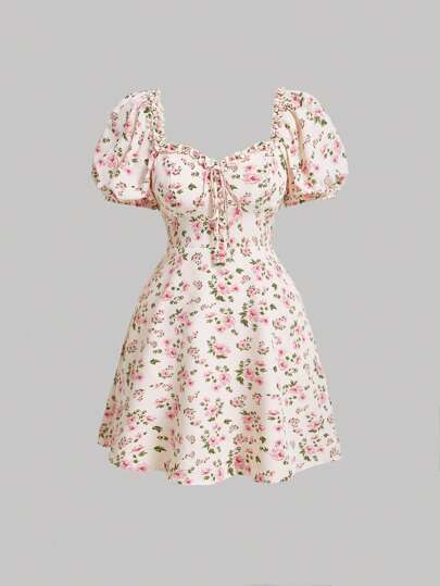 SHEIN MOD Plus Ditsy Floral Print Frill Trim Knot Front Puff Sleeve Dress For Summer - Multicolor - View 1