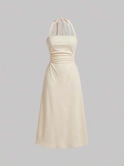 SHEIN MOD Women's Solid Color Halter Neck Ruched Backless Casual Sleeveless Dress - Apricot - View 1