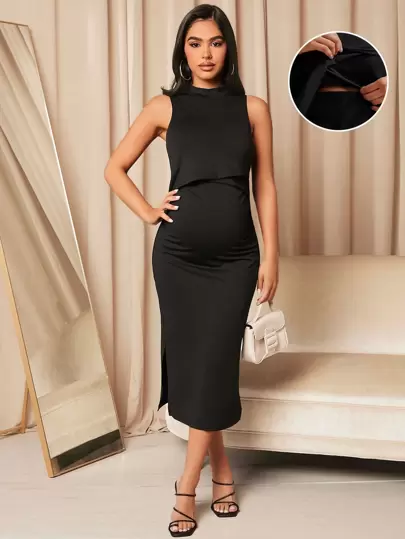 SHEIN Maternity Ruched Front Split Hem Dress - Black - View 1