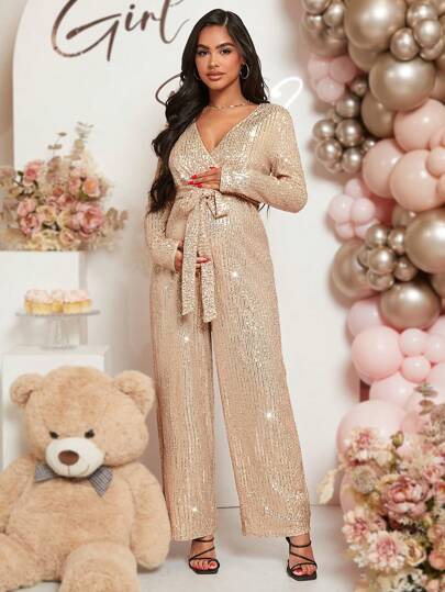 SHEIN Loomaby Maternity Sequin Belted Wide Leg Jumpsuit - Champagne - View 1