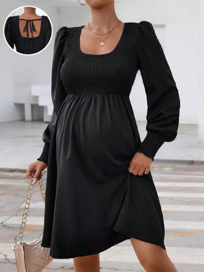 SHEIN Maternity Solid Color Puff Sleeve Casual Dress, Spring Autumn - Black - View 1