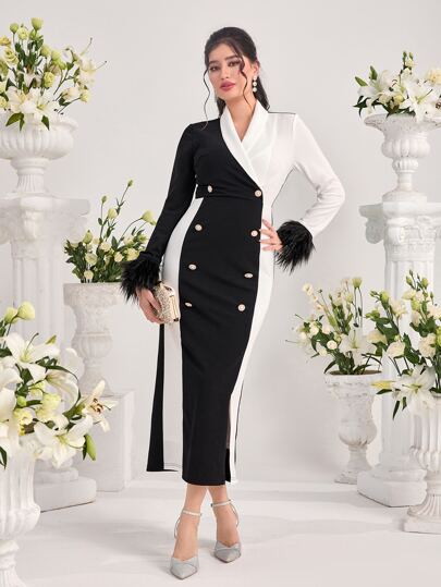 Modelyn Two Tone Shawl Collar Double Breasted Fuzzy Cuff Split Hem Dress - Black and White - View 1