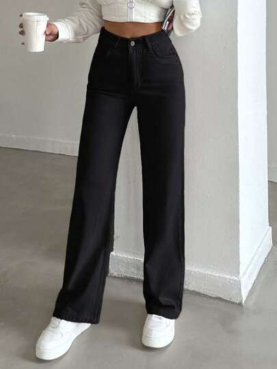 SHEIN PETITE 100%Cotton HIGH RISE BEIGE WIDE LEG PETITE SIZE JEAN - Black - View 1