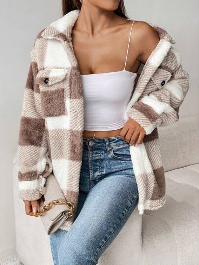 SHEIN PETITE Autumn Winter Casual Plaid Pattern Drop Shoulder Flap Pocket Teddy Coat, Fall Outfit - Khaki - View 1