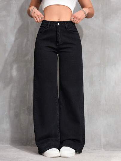 SHEIN PETITE Casual Solid Color Denim Jeans - Black - View 1