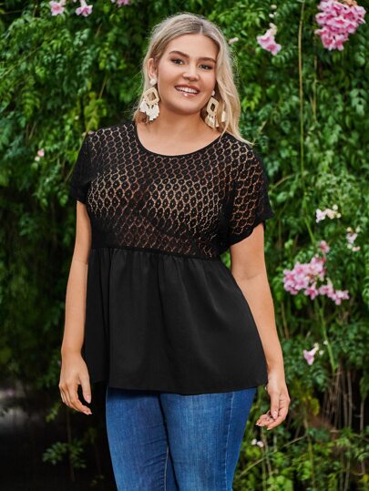 SHEIN Privé Plus Contrast Lace Batwing Sleeve Peplum Top - Black - View 1