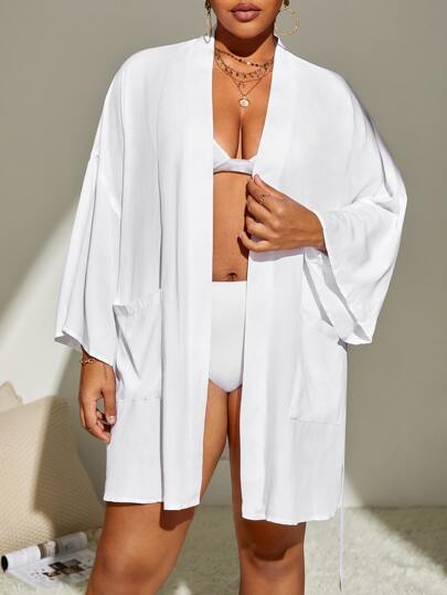 SHEIN Plus Solid Belted Kimono - White - View 1