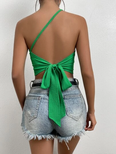 Chiquease One Shoulder Tie Backless Crop Top - Green - View 1
