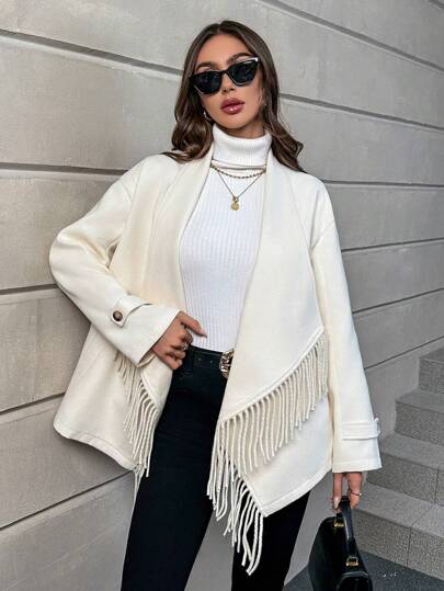 SHEIN Privé Waterfall Collar Fringe Trim Open Front Overcoat - Apricot - View 1