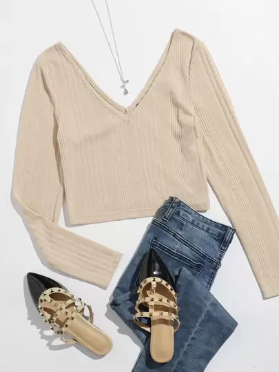 SHEIN Ribbed Long Sleeve Cropped Tee - Beige - View 1